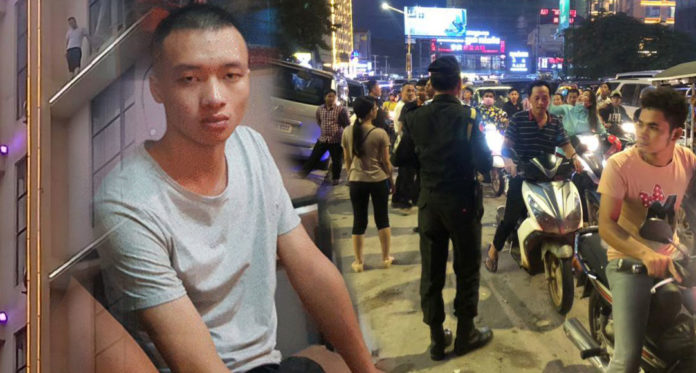 បុរសជនជាតិចិនដែលប៉ុនប៉ងធ្វើអត្តឃាត ដោយលោតពីលើអគារកាស៊ីណូខាងលើនេះ មានឈ្មោះ SI CHANGMENG អាយុ២២ឆ្នាំ។