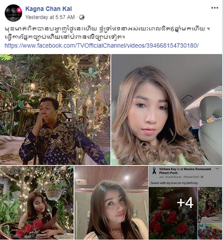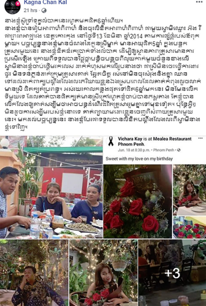 ស្ត្រីជាប្រពន្ធបានបន្តបង្ហោះទៀតថា “នាងខ្ញុំស៊ូទ្រាំទុក្ខលំបាកនេះរហូតមកជិត6ឆ្នាំហើយ។ នាងខ្ញុំបានរៀបអាពាហ៍ពិពាហ៍និងចុះលិខិតអាពាហ៍ពិពាហ៍ជាមួយស្វាមីឈ្មោះ អ៊ង រី ជាព្រះរាជអាជ្ញារងខេត្តកោះកុង នៅថ្ងៃទី13 ខែមិនា ឆ្នាំ2014 តាមការផ្សំផ្គុំរបស់ឪពុកម្តាយ។ បច្ចុប្បន្ននាងខ្ញុំមានចំណងដៃកូនស្រីម្នាក់មានអាយុជិត5ឆ្នាំក្នុងបន្ទុកគ្រួសារមួយនេះ នាងខ្ញុំខិតខំរកប្រាក់ទាំងលំបាកដើម្បីឲ្យស្ថានភាពគ្រួសារមានការប្រសើរឡើង ក្រោយពីទទួលបានផ្លែផ្កាបន្តិចបន្តួចពីលុយកាក់មួយចំនួនខាងលើ ស្វាមីនាងខ្ញុំចាប់ផ្តើមរកលេសដាក់កំហុសមកលើរូបនាងថា ជាស្រីមិនចេះធ្វើការងារផ្ទះមិនទន់ភ្លន់ដាក់ក្រុមគ្រួសារ គាត់ឆ្អែតចិត្តរស់នៅមិនចុះសំរុងនិងគ្នា ឈានទៅដល់ដាក់ពាក្យបណ្តឹងលែងលះភរិយាយខ្លួនឯងស្របពេលដែលគាត់កំពុងលួចលាក់មានស្រី ផិតក្បត់ប្រពន្ធ។ អស់រយៈកាលកន្លងផុតទៅជិត6ឆ្នាំមកនេះ មិនមែនលើកទីមួយទេដែលគាត់បានផិតក្បត់មានស្រីក្រៅរហូតខ្ញុំចាប់បានភស្តុតាង តែខ្ញុំបានលើកលែងឲ្យគាត់សង្ឃឹមថាអាចបន្តដំណើរជីវិតគ្រួសាររួមគ្នាទៅមុខទៀត។ ប៉ុន្តែអ្វីៗមិនដូចការសង្ឃឹមរបស់ខ្ញុំនោះទេ គាត់ព្យាយាមដោះខ្លួនចេញពីសំពាយគ្រួសារមួយនេះ។ មកដល់បច្ចុប្បន្ននេះ នាងខ្ញុំបែរជាទទួលបានលិខិតបណ្តឹងលែងលះពីស្វាមីនាងខ្ញុំទៅវិញ”។