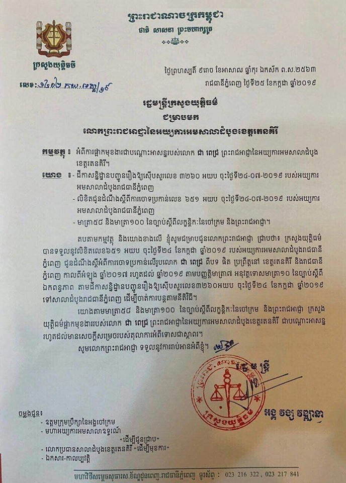 ឯកឧត្តមអង្គ វង្សវឌ្ឍនា ដែលជារដ្ឋមន្ត្រីក្រសួងយុត្តិធម៌ បានសម្រេចផ្អាកការងារបណ្តោះអាសន្នចំពោះលោកព្រះរាជអាជ្ញាសាលាដំបូងខេត្តរតនគិរី លោកជា ពេជ្រ ដោយបានចោទប្រកាន់ពីបទផិត ដែលបានប្រព្រឹត្តនៅខេត្តរតនគិរី និងរាជធានីភ្នំពេញ កាលពីអំឡុងឆ្នាំ២០១៧ រហូតដល់២០១៩។