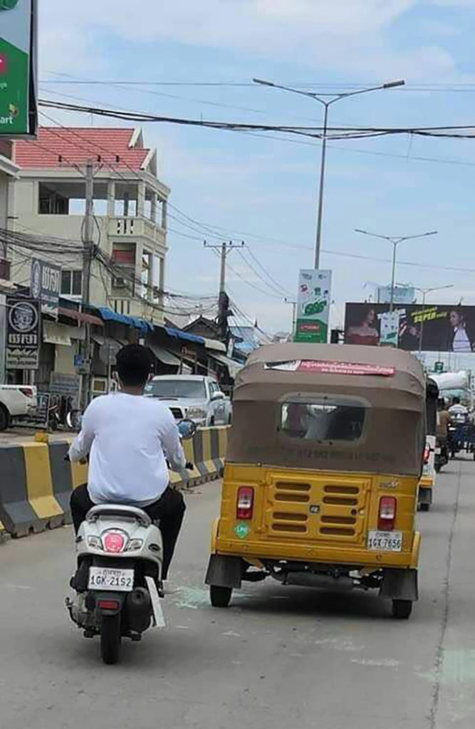 ប្រភពឱ្យដឹងថា នៅមុនពេលកើតហេតុគេឃើញបុរសម្នាក់ជិះម៉ូតូកង់បីឥណ្ឌា តាមបណ្តោយផ្លូវឧកញ៉ាម៉ុង ប្ញទ្ធី ពីលិចទៅកើត ហើយក៏មានម៉ូតូហុងដាស្កុបពី២គ្រឿងបើកតាមពីក្រោយ លុះមកដល់កន្លែងកើតហេតុ ហើយស្កុបពីពណ៌ខ្មៅដែលជិះគ្នា២នាក់ បានអែបកង់បី រួចឆក់កាបូបពីបុរសម្នាក់ តែមិនបានសម្រេចក៏បើកម៉ូតូគេចទៅមុខ ដោយឡែកស្កុបពីពណ៌ស ពាក់ស្លាកលេខភ្នំពេញ 1GK-2192 ដែលបើកបិទគូទពីក្រោយ ត្រូវកម្លាំងនគរបាលដែលកំពុងជិះក្បាតឃាត់ខ្លួនបានភ្លាមៗ។