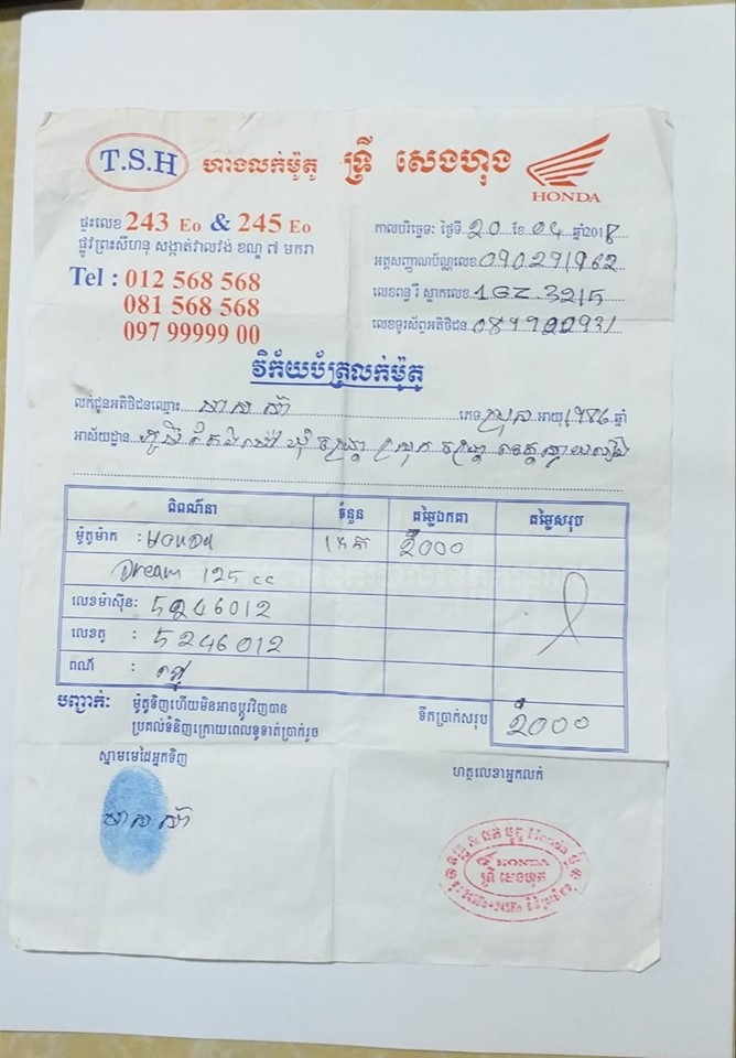 ប្រភពពីសមត្ថកិច្ចនគរបាលឱ្យដឹងថា ម៉ូតូដែលជនសង្ស័យខ្ចីពីជនរងគ្រោះបោកយកទៅលក់នោះ ម៉ាកហុងដាឌ្រីម សេ១២៥ ពណ៌ខ្មៅ ស៊េរីឆ្នាំ២០១៨ ពាក់ស្លាកលេខភ្នំពេញ 1GZ- 3215។ នៅពេលឃាត់ខ្លួនដកហូតបានម៉ូតូ ម៉ាកហុងដាឌ្រីម សេ១២៥ ស៊េរីឆ្នាំ២០១៩ ជារបស់ជនសង្ស័យ។