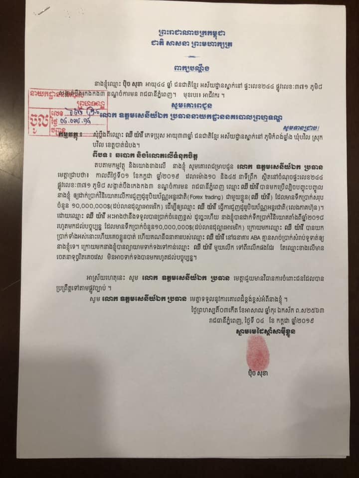 លោកឧត្តមសេនីយ៍ទោ បន្ថែមថា ជនសង្ស័យខាងលើបានប្រើល្បិចបញ្ចុះបញ្ចូលឱ្យជនរងគ្រោះជាច្រើននាក់ដាក់ប្រាក់វិនិយោគលើការជួញដូររូបិយប័ណ្ណអន្តរជាតិ (Forex Trading) ដោយអះអាងថា នឹងទទួលបានប្រាក់ចំណេញខ្ពស់។ ប៉ុន្តែក្រោយមកជនសង្ស័យបានយកប្រាក់ ហើយគេចខ្លួនបាត់ ទើបជនរងគ្រោះបានមកដាក់ពាក្យបណ្តឹងជាបន្តបន្ទាប់។