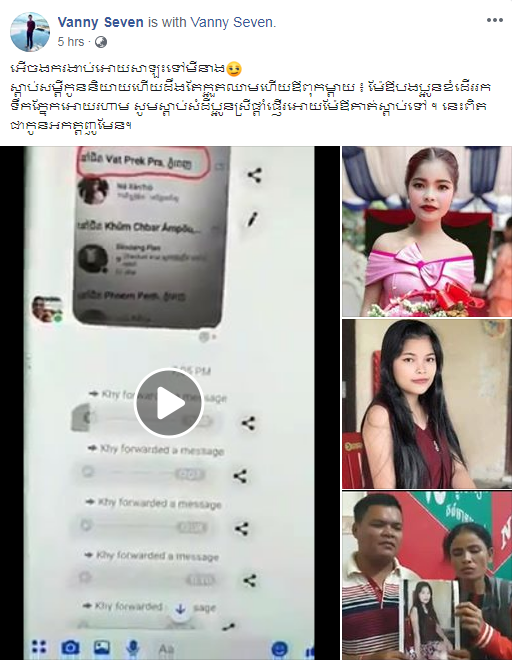 ករណីកូនស្រីបាត់ខ្លួននេះបានកើតមានការភ្ញាក់ផ្អើលឡើង តាំងពីរសៀលថ្ងៃទី០៧ ខែសីហា ឆ្នាំ២០១៩មកម៉្លេះ ខណៈដែលយុវតីរូបនោះបានចេញទៅរៀនកួរនៅវិទ្យាល័យព្រែកសណ្តែក។ លុះមកដល់ថ្ងៃទី១៣ ខែសីហា ឆ្នាំ២០១៩ ពោលគឺ៦ថ្ងៃក្រោយមកស្រាប់តែឪពុកម្តាយបានទទួលដំណឹងពីកូនស្រីតាមរយៈឆាត ដោយគំរាមមិនឱ្យតាមរកនាងទៀតទេ ពុំនោះទេនាងនឹងចងកសម្លាប់ខ្លួនហើយ។