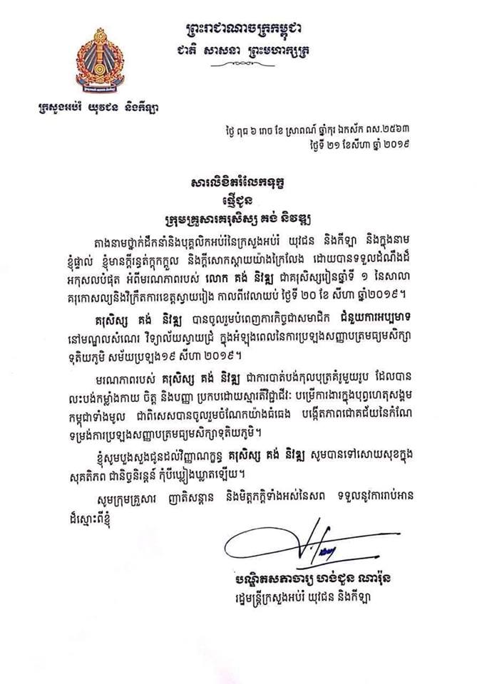 ដោយឡែក លោកហង់ជួន ណារ៉ុន រដ្ឋមន្ត្រីក្រសួងអប់រំ យុវជន និងកីឡា ក៏បានផ្ញើសារលិខិតរំលែកទុក្ខមួយផងដែរ ផ្ញើជូនក្រុមគ្រួសារគរុសិស្ស គង់ និវឌ្ឍ ដែលមានខ្លឹមសារទាំងស្រុងដូចខាងក្រោម ៖