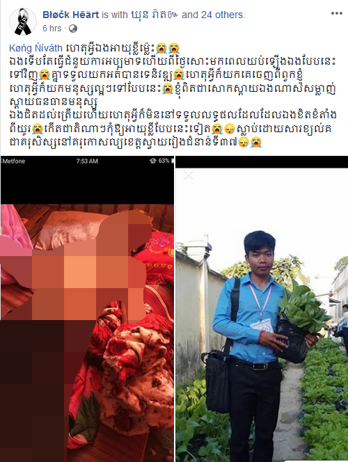 ជនរងគ្រោះខាងលើមានឈ្មោះគង់ និវឌ្ឍ ភេទប្រុស អាយុ21ឆ្នាំ មុខរបរជាគរុសិស្ស ថ្នាក់ទី 12+2A1 ឆ្នាំទី1 ជំនាន់ទី37 នៃសាលាគរុកោសល្យនិងវិក្រិតការខេត្តស្វាយរៀង ស្នាក់នៅក្នុងវត្តព្រៃឆ្លាក់ ស្ថិតក្នុងភូមិសង្កាត់កើតហេតុខាងលើ និងមានស្រុកកំណើតនៅ ភូមិតាភរ ឃុំចន្ត្រី ស្រុករមាសហែក។ ជនរងគ្រោះមានឪពុកឈ្មោះគង់ វទ្ធី អាយុ46ឆ្នាំ ជាគ្រូបង្រៀននៅស្រុករមាសហែក។