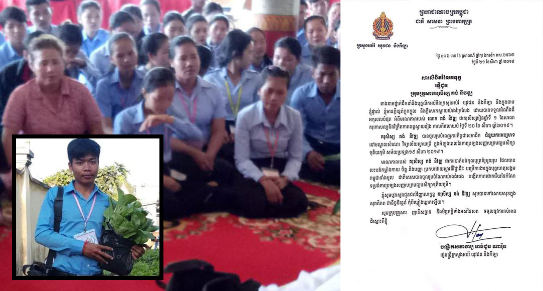 តាងនាមថ្នាក់ដឹកនាំមន្ត្រីរាជការនិងបុគ្គលិកអប់រំ នៃក្រសួងអប់រំ យុវជន និងកីឡា និងក្នុងនាមខ្ញុំផ្ទាល់ ខ្ញុំមានក្តីរន្ធត់ក្តុកក្តួលនិងក្តីសោកស្តាយយ៉ាងក្រៃលែង ដោយទទួលដំណឹងដ៏អកុសលបំផុតពីមរណៈភាពរបស់លោកគង់ និវឌ្ឍ ជាគរុសិស្សរៀនឆ្នាំទី1 សាលាគរុកោសល្យនិងវិក្រឹត្យការខេត្តស្វាយរៀង កាលពីយប់ថ្ងៃទី 20 ខែសីហា ឆ្នាំ2019។