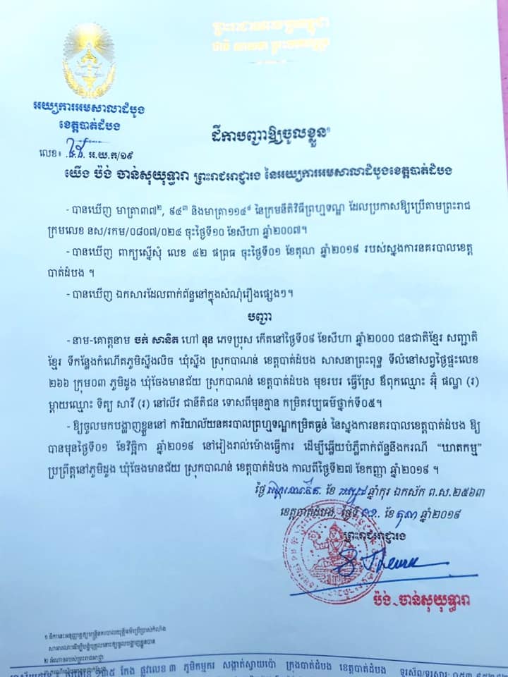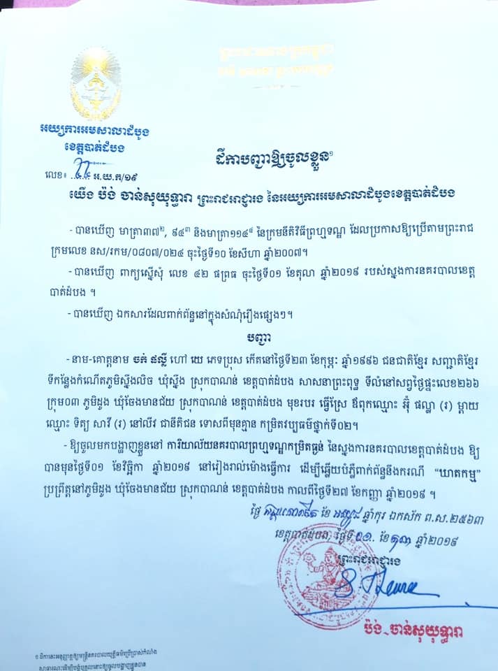 ខេត្តបាត់ដំបង ៖ ដោយអនុវត្តតាមដីកាបង្គាប់ឱ្យនាំខ្លួនរបស់អយ្យការអមសាលាដំបូងខេត្តបាត់ដំបង និងអនុវត្តតាមបទបញ្ជាដ៏ម៉ឹងម៉ាត់របស់លោកឧត្តមសេនីយ៍ទោ អ៊ុច សុខុន ស្នងការនៃស្នងការដ្ឋាននគរបាលខេត្តបាត់ដំបង កាលពីថ្ងៃទី០២ ខែតុលា ឆ្នាំ២០១៩។