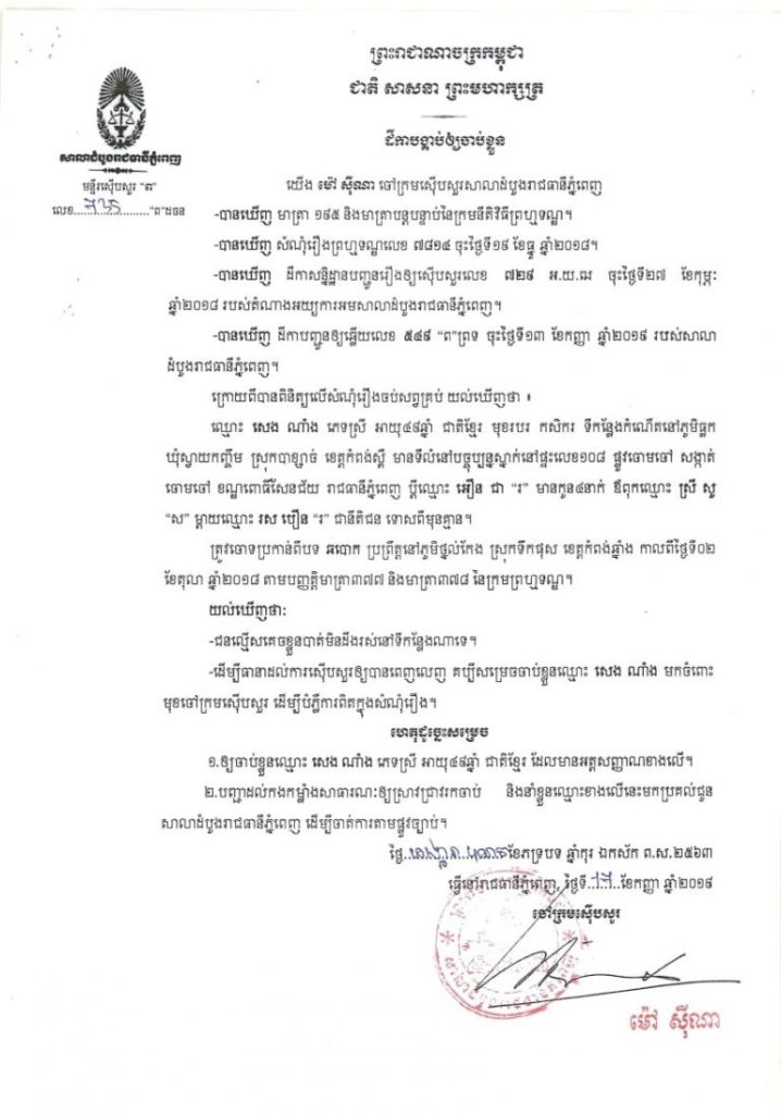 លោកវរសេនីយ៍ឯក ប៊ុន សត្យា នាយការិយាល័យនគរបាលព្រហ្មទណ្ឌកំរិតស្រាល បានឱ្យដឹងថា ការចាប់ខ្លួនស្ត្រីសង្ស័យខាងលើនេះ ធ្វើឡើងតាមដីកាបង្គាប់ឱ្យចាប់ខ្លួនលេខ៧៣៥ “ព” ដ.ច.ន ចុះថ្ងៃទី១៧ ខែកញ្ញា ឆ្នាំ២០១៩ ចេញដោយលោកម៉ៅ ស៊ីណា ចៅក្រមស៊ើបសួរសាលាដំបូងរាជធានីភ្នំពេញ។