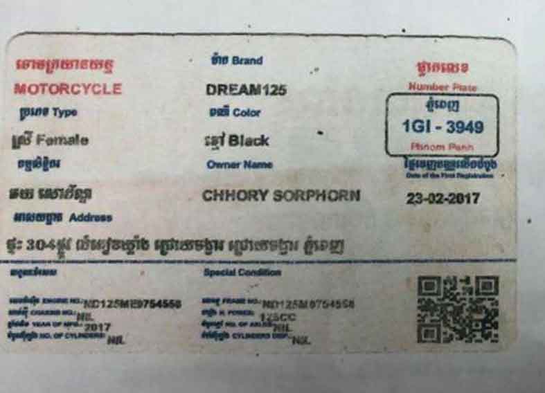 ម៉ាកហុងដាឌ្រីមសេ១២៥ ស៊េរីឆ្នាំ២០១៧ ពណ៌ខ្មៅ ពាក់ស្លាកលេខភ្នំពេញ 1GI-3949។