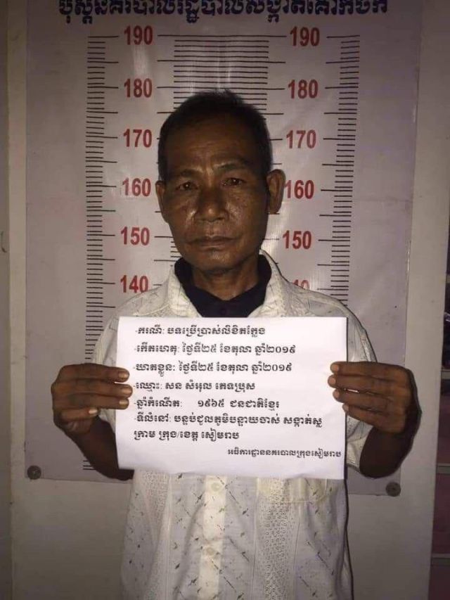 ទី១-ឈ្មោះសន សំអុល ភេទប្រុស អាយុ៥៥ឆ្នាំ មុខរបរមិនពិតប្រាកដ ស្នាក់នៅបន្ទប់ជួលក្នុងភូមិបន្ទាយចាស់ សង្កាត់ស្លក្រាម ក្រុងសៀមរាប (ឃាត់ខ្លួនថ្ងៃទី២៥ ខែតុលា ឆ្នាំ២០១៩)។