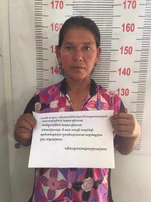 ទី២-ឈ្មោះឌី សាន ភេទស្រី អាយុ៥៥ឆ្នាំ ស្នាក់នៅបន្ទប់ជួលក្នុងភូមិបន្ទាយចាស់ សង្កាត់ស្លក្រាម ក្រុងសៀមរាប (ឃាត់ខ្លួនថ្ងៃទី២៦ ខែតុលា ឆ្នាំ២០១៩)។