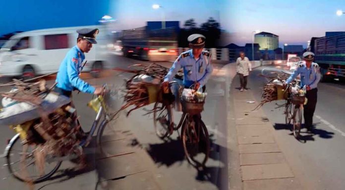 រូបភាព៣សន្លឹកដែលបង្ហាញពីសកម្មភាពមន្ត្រីប៉ូលិសចរាចរណ៍ម្នាក់ បានជួយបណ្តើរកង់បុរសចំណាស់ម្នាក់ដែលបានដឹកឈើពេញលើរានខាងក្រោយ ឆ្លងស្ពានគីហ្សូណា ធ្វើឲ្យមហាជនជាច្រើនភ្ញាក់ផ្អើលនិងសរសើរពេញៗមាត់។