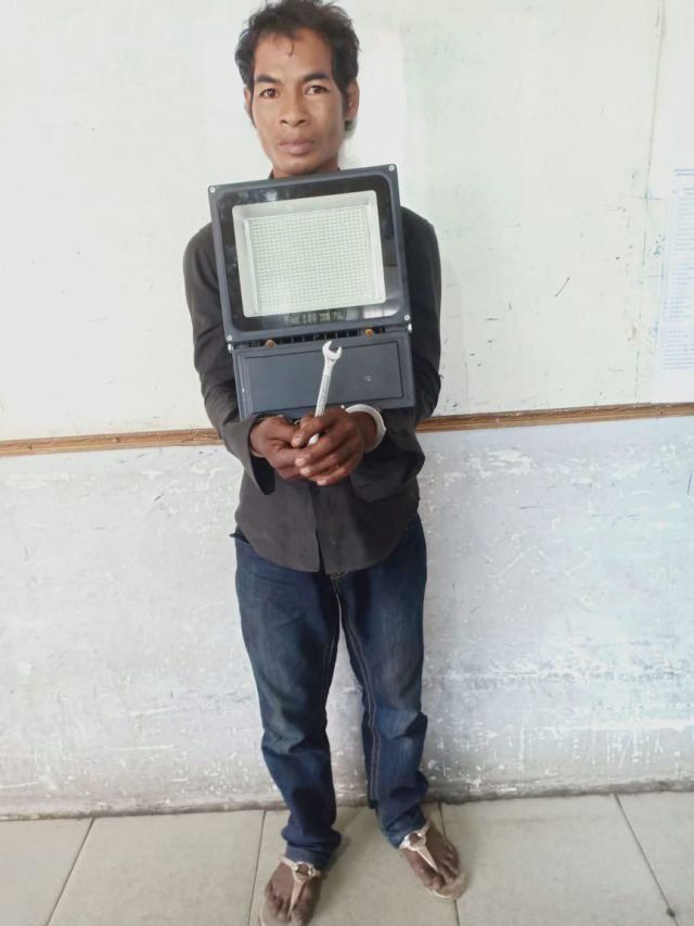 ជនសង្ស័យខាងលើ មានឈ្មោះឡុង សេនាលី ភេទប្រុស អាយុ៤៧ឆ្នាំ មុខរបរនិងលំនៅមិនពិតប្រាកដ។ វត្ថុតាងចាប់យកអំពូលភ្លើងហ្វា ម៉ាក IP66-200w ពណ៌ខ្មៅ ទំហំ២៥សង់ទីម៉ែត្រគុណនឹង ៣៥សង់ទីម៉ែត្រ មួយគ្រាប់។ កូនសោដោះលេខ១២ ម៉ាក THC មួយដើម។