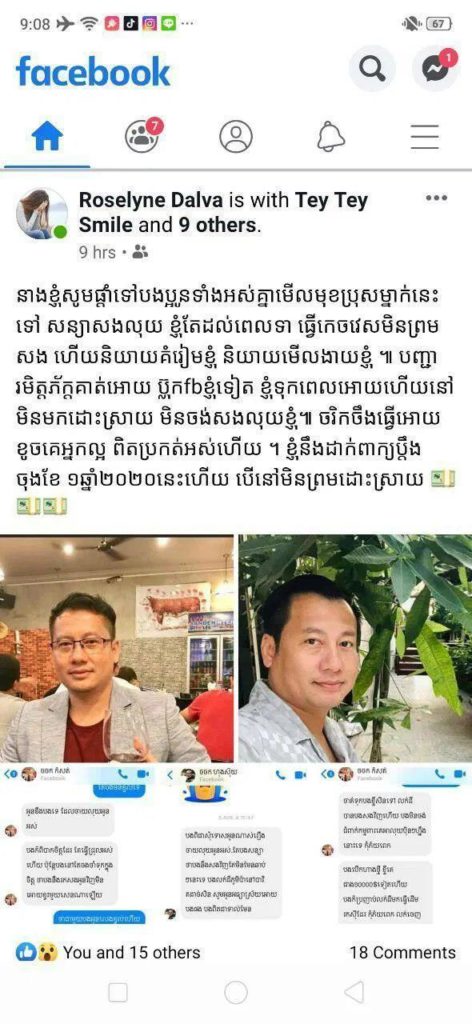 នារីដដែលនេះបានបន្ថែមថា “នាងខ្ញុំសូមផ្ដាំទៅបងប្អូនទាំងអស់គ្ មើលមុខប្រុសម្នាក់នេះទៅ សន្យាសងលុយតែដល់ពេលទារ ធ្វើគេចវេសមិនព្រមសង ហើយនិយាយគំរាមខ្ញុំ និយាយមើលងាយខ្ញុំ បញ្ជាមិត្តភក្ដិគាត់ឲ្យប្លុកហ្វេសប៊ុកខ្ញុំទៀត ខ្ញុំទុកពេលឲ្យហើយ នៅមិនមកស្រាយមិនចង់សងលុយខ្ញុំ។ ចរិតអ៊ីចឹងធ្វើឲ្យខូចគេអ្នកល្អពិតប្រាកដអស់ហើយ។ ខ្ញុំនឹងដាក់ពាក្យបណ្ដឹងចុងខែ១ ឆ្នាំ២០២០នេះហើយ បើនៅមិនព្រមដោះស្រាយ”។