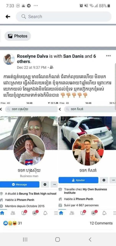 បើតាមហ្វេសប៊ុកនារីម្នាក់ មានឈ្មោះ Roselyne Dalva បានបង្ហោះសារថា “ការអត់ធ្មត់មនុស្ស មានដែនកំណត់ ជំពាក់លុយគេហើយ មិនមកដោះស្រាយ ធ្វើសម្ដីទ្បូយទៀត ខ្ញុំទុកពេលឲ្យ១ឆ្នាំហើយ ព្រោះការយោគយល់ តែអ្នកឯងមិនដែលយល់ដល់ខ្ញុំទេ ប្លុកហ្វេសបុកខ្ញុំអស់ ហើយខ្ញុំព្យាយាម ទាក់ទងក៏មិនបាន”។