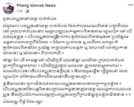 ខណៈដែលអ្នកលេងហ្វេសប៊ុកមួយចំនួនបានធ្វើការរិះគន់អាជ្ញាធរខេត្តបាត់ដំបង ពីបញ្ហាដីហុយនៅកណ្តាលក្រុងនោះ នៅថ្ងៃនេះ លោកផែង វណ្ណៈ បង្ហោះសារព្រមានទៅអ្នករិះគន់ទាំងនោះថា ឲ្យបញ្ឈប់ការរិះគន់ភ្លាម បើចង់សុខខ្លួន។