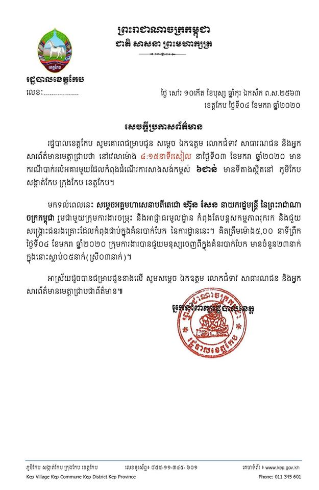 តាមលិខិតរបស់រដ្ឋបាលខេត្តកែប បានបញ្ជាក់ឲ្យដឹងថា គិតមកដល់វេលាម៉ោង៥ព្រឹក ថ្ងៃទី០៤ ខែមករា ឆ្នាំ២០២០ ចំនួនអ្នកស្លាប់និងរបួសក្នុងហេតុការប្រាក់ស្រុតអគារកម្ពស់៦ជាន់ឡើងដល់២៣នាក់ ស្លាប់៥នាក់ (ស្រី៣នាក់)។