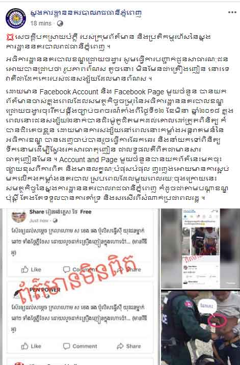ប្រភពដដែលបានបន្តថា “ដោយមាន Facebook Account និង Facebook Page មួយចំនួន បានយកព័ត៌មានចាស់ក្នុងពេលដែលសមត្ថកិច្ចចម្រុះនៃអធិការដ្ឋាននគរបាលខណ្ឌជ្រោយចង្វារ ចុះរឹតបន្តឹងច្បាប់ចរាចរណ៍តាំងពីថ្ងៃទី១២ ខែមិនា ឆ្នាំ២០១៨ ក្នុងពេលនោះជនសង្ស័យ២នាក់បានជិះម៉ូតូជិតមកដល់គោលដៅត្រួតពិនិត្យ ក៏បានជិះគេចខ្លួន ដោយមានសង្ស័យ នៅពេលនោះកម្លាំងអន្តរាគមន៍ខណ្ឌ បានដេញចាប់បានរួចធ្វើការឆែកឆេរ និងនាំយកទៅពិនិត្យទឹកនោមដើម្បីស្វែងរកសារធាតុញៀន ជាលទ្ធផលគឺពិតជាមានសារធាតុញៀនមែន”។