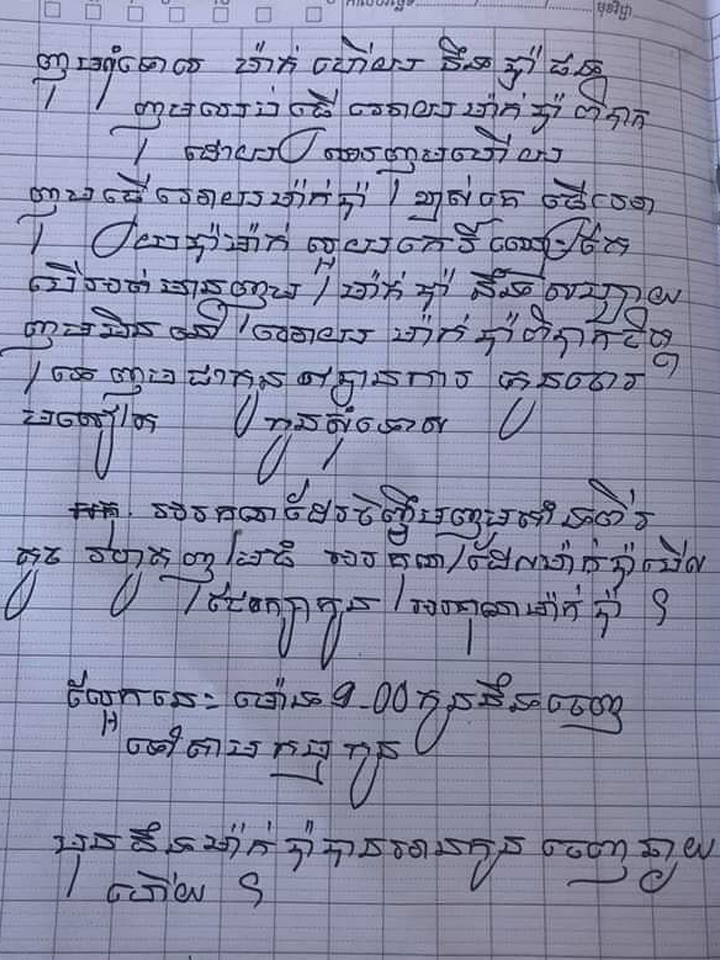 ស្អែកនេះម៉ោង៩.០០ កូននឹងចេញទៅតាមកម្មកូន មុននឹងម៉ាក់ប៉ាបានអាន កូនចេញឆ្ងាយហើយ។ ខ្ញុំធ្វើឱ្យម៉ាក់ប៉ាខ្មាសគេខ្លាំង លក់មុខខ្លាំង ខ្ញុំសន្យាថា នឹងចេញពីលោកទាំងពីរ។ កុំតាមរកខ្ញុំអី ឥតប្រយោជន៍ទេ ព្រោះខ្ញុំទៅឆ្ងាយទៅតាមកម្មរបស់ខ្ញុំ។ សុំទោសណាប៉ាម៉ាក់…”។