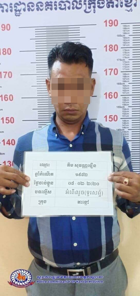 ចំណែកជនសង្ស័យមានឈ្មោះភីម សុវណ្ណធឿន ភេទប្រុស អាយុ៣៨ឆ្នាំ ជនជាតិខ្មែរ សញ្ជាតិអាមេរិក មុខរបរគ្រូបង្រៀនភាសាអង់គ្លេស ស្នាក់នៅផ្ទះសំណាក់ (ចល័ត) ក្នុងក្រុងតាខ្មៅ។ រីឯវត្ថុតាងចាប់យកទូរស័ព្ទ១គ្រឿង ម៉ាក iPhone 7plus ពណ៌ខ្មៅ។