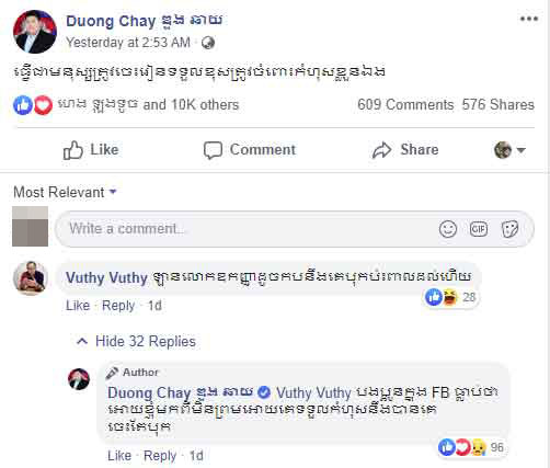 ក្រោយពីជួបគ្រោះថ្នាក់ចរាចរណ៍ លោកឧកញ៉ាឌួង ឆាយ បានបង្ហោះសារលើទំព័រហ្វេសប៊ុកថា “ធ្វើជាមនុស្សត្រូវចេះរៀនទទួលខុសត្រូវចំពោះកំហុសខ្លួនឯង” ភ្លាមនោះក៏មានបុរសម្នាក់ចូលទៅ Comment ថា ”ឡានលោកឧកញ្ញាដូចកបនឹងគេបុកប៉ះពាលដល់ហើយ” បន្ទាប់មកលោកឧកញ៉ាបានReply ថា “បងប្អូនក្នុង FB ធ្លាប់ថាអោយខ្ញុំ មកពីមិនព្រមអោយគេទទួលកំហុស នឹងបានគេចេះតែបុក”។