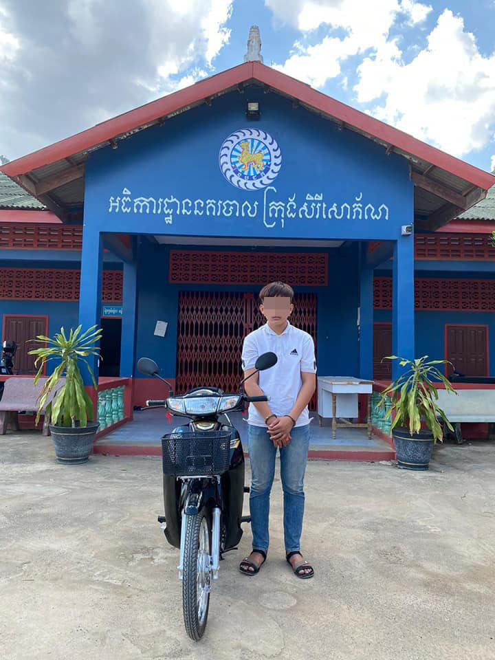 ជនសង្ស័យដែលត្រូវសមត្ថកិច្ចចាប់ឃាត់ខ្លួនរូបនេះ មានឈ្មោះណាប់ សុខា ភេទប្រុស អាយុ១៨ឆ្នាំ មុខរបរមិនពិតប្រាកដ។ ចំណែកម៉ូតូដែលជនសង្ស័យលួចម៉ាកហុងដាឌ្រីមស៊េរីឆ្នាំ២០១៩ ពណ៌ខ្មៅ ពាក់ស្លាកលេខ ប.មានជ័យ 1U-5998 ជាកម្មសិទ្ធិរបស់ឈ្មោះភឿន កេសី ភេទស្រី អាយុ១៥ឆ្នាំ មុខរបរសិស្សវិទ្យាល័យសិរីសោភ័ណ មានលំនៅក្នុងភូមិគោរដ្ឋាន សង្កាត់អូរអំបិល ក្រុងសិរីសោភ័ណ។