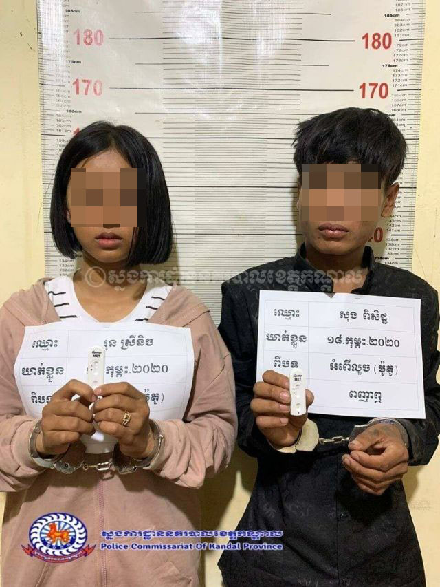 ជនសង្ស័យជាគូស្នេហ៍ត្រូវឃាត់ខ្លួននេះ ខាងប្រុសមានឈ្មោះសុង ពិសិដ្ឋ ភេទប្រុស អាយុ១៨ឆ្នាំ មុខរបរ មិនពិតប្រាកដ ទីលំនៅផ្ទះជួល សង្កាត់ភ្នំពេញថ្មី ខណ្ឌសែនសុខ រាជធានីភ្នំពេញ។ ខាងស្រីមានឈ្មោះ រុន ស្រីនិច ភេទស្រី អាយុ១៦ឆ្នាំ មុខរបរ បុគ្គលិក កន្លែងលក់មីហិរ ទីលំនៅភូមិពោធិមង្គល ឃុំព្រែកតាទែន ស្រុកពញាឮ ខេត្តកណ្តាល។ អ្នកទាំង២សមត្ថកិច្ចរកឃើញមានសារធាតុញៀន។