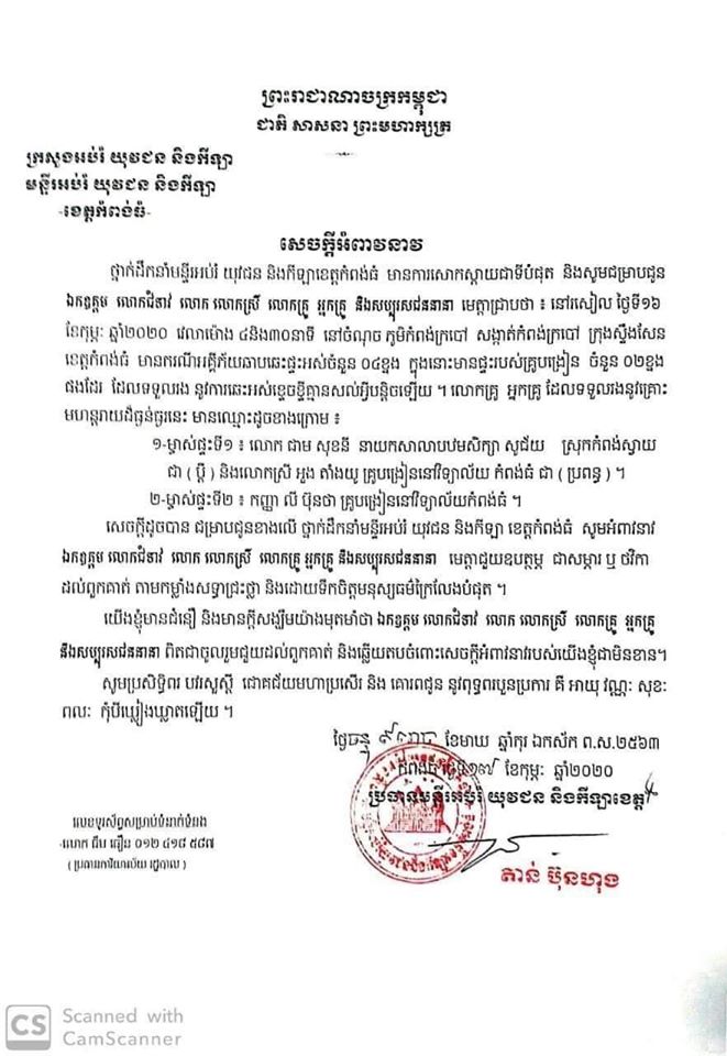 កំពង់ធំ៖ ស្ត្រី២នាក់ដែលគេស្គាល់ថា ជាគ្រូបង្រៀននៅនៅវិទ្យាល័យកំពង់ធំ បានជួបទុក្ខធំ ដោយសារភ្លើងឆេះផ្ទះអស់សល់តែផេះ ដែលអ្នកគ្រូទាំង២នាក់បានខិតខំប្រឹងប្រែងដោយ កម្លាំងញើសឈាមសុទ្ធសាធ ត្រូវបានមិត្តភក្តិ និងមិត្តរួមការងារ ប្រកាសស្វែងរកថវិកាដើម្បីជួយសម្រាលបន្ទុក។