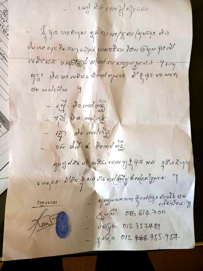 សូមថ្នាក់ដឹកនាំអភ័យទោសឱ្យខ្ញុំបាទផង ខ្ញុំដឹងកំហុស ហេតុនេះជីវិតខ្ញុំសងនឹងការប្រព្រឹត្តដ៏អាក្រក់មួយនេះ។ សូមជួយយកសពខ្ញុំទៅស្រុកកំណើតផង នៅព្រៃវែង…”។