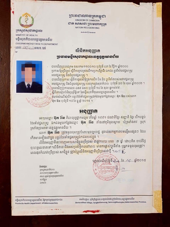 ចំណែកគ្រូពេទ្យប្រើថ្នាំខុសបច្ចេកទេសបណ្តាលឱ្យគេស្លាប់ និងត្រូវសមត្ថកិច្ចចាប់ឃាត់ខ្លួននោះ មានឈ្មោះអ៊ុក រ៉ែន ភេទប្រុស អាយុ២៩ឆ្នាំ រស់នៅភូមិគោកសំព័រ ឃុំលំទង ស្រុកអន្លង់វែង។