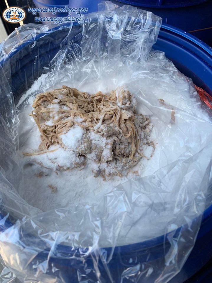 ក្រុងព្រះសីហនុ៖ ពោះវៀនជ្រូកប្រឡាក់អំបិលសម្រាប់ធ្វើសាច់ក្រក នាំចូលពីប្រទេសចិន ចំនួន៦កុងតឺន័រ ដែលបានដឹកមកដល់កំពុងផែស្វយ័តក្រុងព្រះសីហនុ ត្រូវបានមន្ត្រីកាំកុងត្រូលចុះត្រួតពិនិត្យគុណភាព។