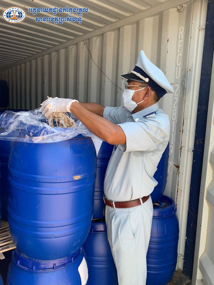 បើតាមអគ្គនាយកដ្ឋានកាំកុងត្រូល បានឲ្យដឹងថា បន្ទាប់ពីទទួលបានការស្នើសុំកិច្ចសហការពីសាខាគយ និងរដ្ឋាករកម្ពុជា ខេត្តព្រះសីហនុ, សាខាកាំកុងត្រូលខេត្តព្រះសីហនុ បានចូលរួមសហការត្រួតពិនិត្យទំនិញ ពោះវៀនជ្រូកប្រឡាក់អំបិលសម្រាប់ធ្វើសាច់ក្រក នាំចូលពីប្រទេសចិន ចំនួន ៦ កុងតៃន័រ របស់ក្រុមហ៊ុន T.B.L.A EX-IM Co.,LTD នៅទីលានកំពង់ផែស្វយ័តក្រុងព្រះសីហនុ។