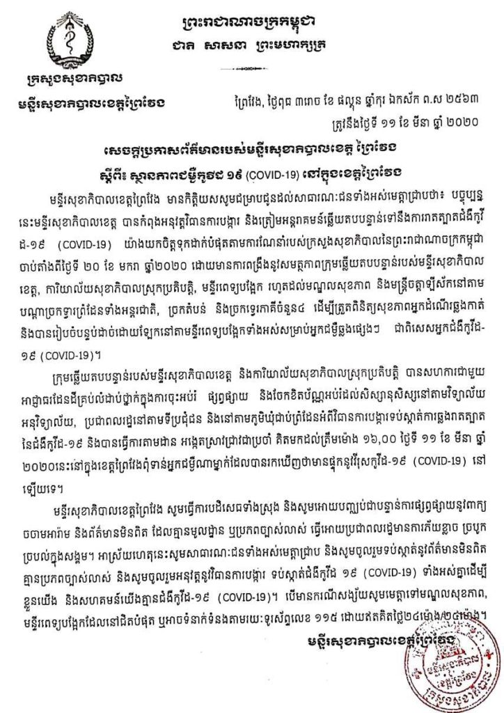 នៅក្នុងសេចក្តីប្រកាសរបស់មន្ទីរសុខាភិបាលខេត្តព្រៃវែង បានឲ្យដឹងថា គិតត្រឹមម៉ោង៤ល្ងាច ថ្ងៃទី១១ ខែមីនា ឆ្នាំ២០២០នេះ ប្រជាពលរដ្ឋនៅខេត្តព្រៃវែង មិនមានអ្នកណាម្នាក់ផ្ទុកវីរុសកូវីដ១៩។ សូមបញ្ឈប់ជាបន្ទាន់ការផ្សព្វផ្សាយនូវពាក្យចចាមអារ៉ាម និងព័ត៌មានមិនពិត ធ្វើឲ្យប្រជាពលរដ្ឋមានការភ័យខ្លាច និងច្របូកច្របល់ក្នុងសង្គម។