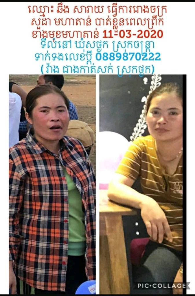 ស្ត្រីដែលបាត់ខ្លួនខាងលើ មានឈ្មោះឆឹង សារ៉ាយ អាយុ៤០ឆ្នាំ មុខរបរធ្វើការរោងចក្រ នៅតំបន់សេដ្ឋកិច្ចពិសេសមេហាធេន ក្រុងបាវិត មានលំនៅក្នុងភូមិពោធិ៍ ឃុំមេសថ្ងក ស្រុកចន្ទ្រា។ ស្ត្រីរូបនេះបានបាត់ខ្លួនតាំងពីវេលាម៉ោង៦ព្រឹក ថ្ងៃទី១១ ខែមីនា ឆ្នាំ២០២០ បន្ទាប់ពីចេញទៅធ្វើការនៅតំបន់សេដ្ឋកិច្ចពិសេសក្រុងបាវិត រួចក៏លែងត្រឡប់មកផ្ទះតែម្តង។