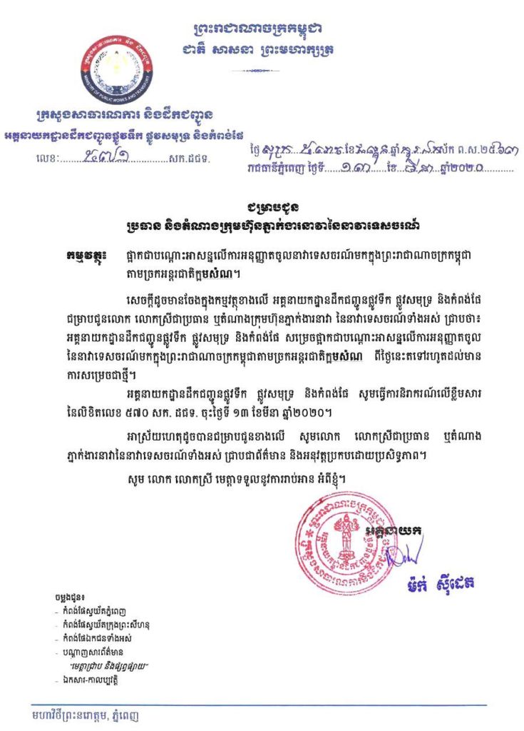 អគ្គនាយកដ្ឋានដ្ឋានដឹកជញ្ជូនផ្លូវទឹក ផ្លូវសមុទ្រ និងកំពង់ផែ សូមធ្វើការនារាករណ៍លើខ្លឹមសារនៃលិខិតលេខ៥៧០សក.ដជទ ចុះថ្ងៃទី១៣ ខែមីនា ឆ្នាំ២០២០។