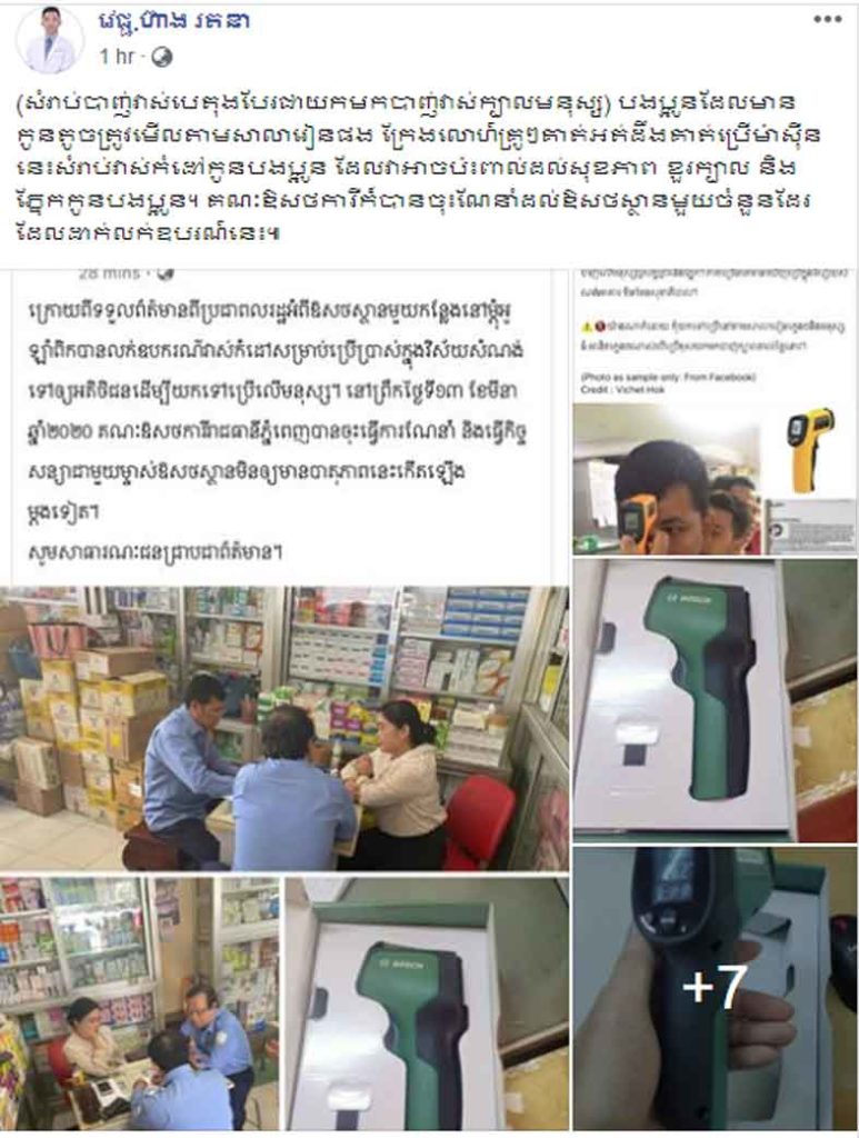 គណឱសថការីកម្ពុជា បានបង្ហោះសារថា “ក្រោយពីទទួលព័ត៌មានពីប្រជាពលរដ្ឋអំពីឱសថស្ថានមួយកន្លែងនៅម្ដុំអូឡាំពិកបានលក់ឧបករណ៍វាស់កំដៅសម្រាប់ប្រើប្រាស់ក្នុងវិស័យសំណង់ ទៅឲ្យអតិថិជនដើម្បីយកទៅប្រើលើមនុស្ស។ នៅព្រឹកថ្ងៃទី១៣ ខែមីនា ឆ្នាំ២០២០ គណៈឱសថការីរាជធានីភ្នំពេញបានចុះធ្វើការណែនាំ និងធ្វើកិច្ចសន្យាជាមួយម្ចាស់ឱសថស្ថានមិនឲ្យមានបាតុភាពនេះកើតឡើងម្ដងទៀត។