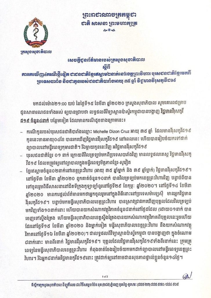 មនុស្ស៤នាក់ រួមទាំងកុមារអាយុ៤ឆ្នាំម្នាក់ កើតជំងឺកូវី១៩ នៅកម្ពុជា