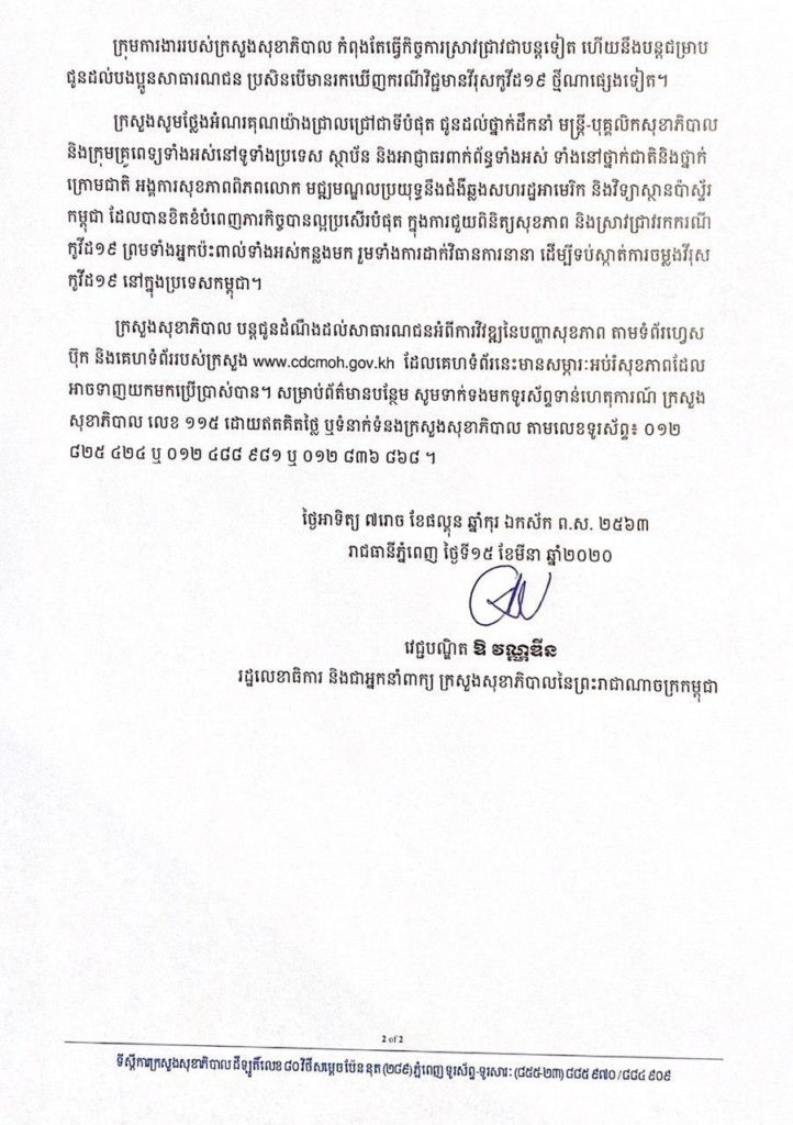៤៖ ចំពោះមន្ត្រីរាជការ និងប្រជាពលរដ្ឋកម្ពុជាទាំងឡាយណា ដែលទើបវិលត្រឡប់ពីបណ្ដាលប្រទេសនៅអឺរ៉ុប សហរដ្ឋអាមេរិក និងអ៊ីរ៉ង់ ត្រូវដាក់ខ្លួនឱ្យនៅដោយឡែក ក្នុងរយៈពេល ១៤ថ្ងៃ គិតចាប់ពីថ្ងៃដែលបានត្រឡប់មកដល់ប្រទេសកម្ពុជាវិញ ស្របតាមនីតិវិធីកំណត់ដោយក្រសួងសុខាភិបាល៕