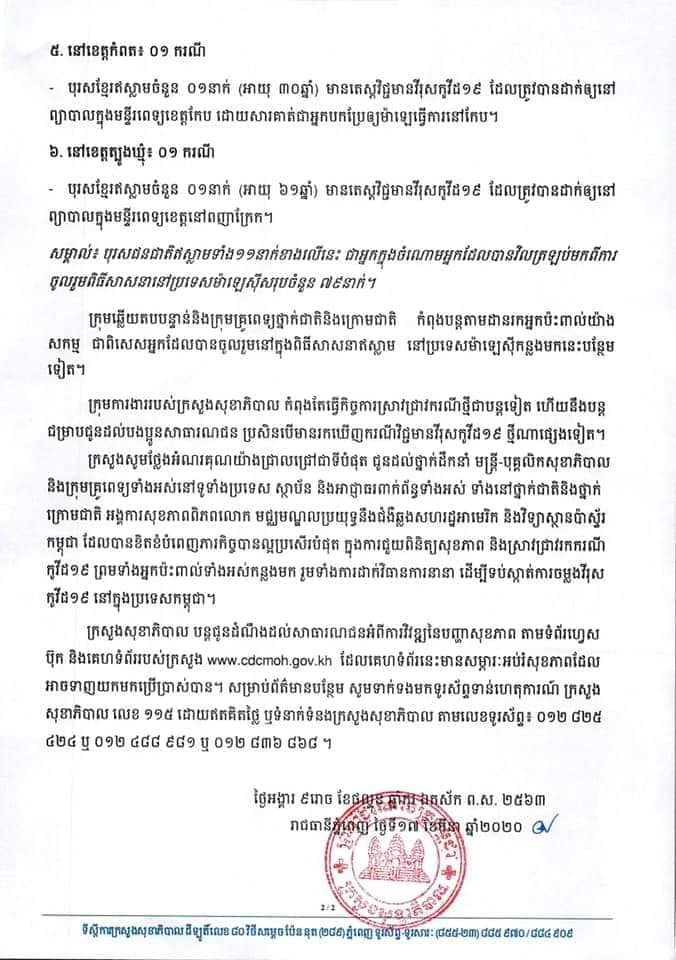 យ៉ាងណាក្រុមឆ្លើយតបបន្ទាន់ និងក្រុមគ្រូពេទ្យថ្នាក់ជាតិ និងក្រោមជាតិ កំពុងបន្តតាមដានរកអ្នកប៉ះពាល់យ៉ាងសកម្ម ជាពិសេសអ្នកដែលបានចូលរួមនៅក្នុងពិធីសាសនាឥស្លាម នៅប្រទសម៉ាឡេស៊ី កន្លងមកបន្ថែមទៀត។