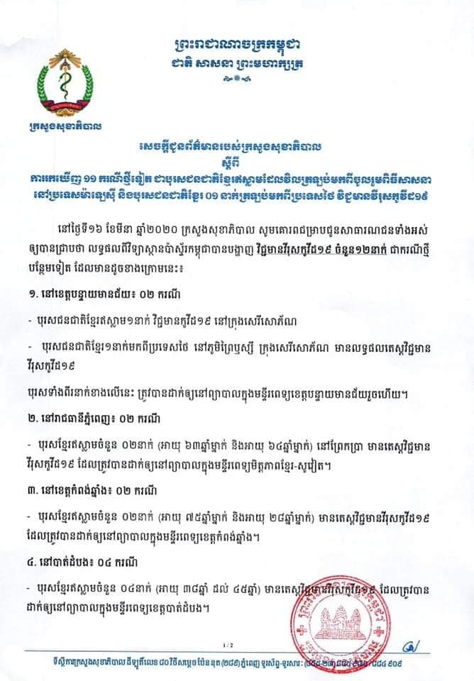 គិតត្រឹមថ្ងៃទី១៦ ខែមីនា ឆ្នាំ២០២០ ក្រសួងសុខាភិបាលាបានរកឃើញមនុស្ស១២នាក់ ឆ្លងជំងឺកូវីត១៩ ដែលចំនួន១១នាក់ ក្នុងចំណោម៧៩នាក់ ទើបតែមកពីចូលរួមពិធីសាសនានៅប្រទេសម៉ាឡេស៊ី និង១នាក់ ទើបត្រឡប់មកប្រទេសថៃ។