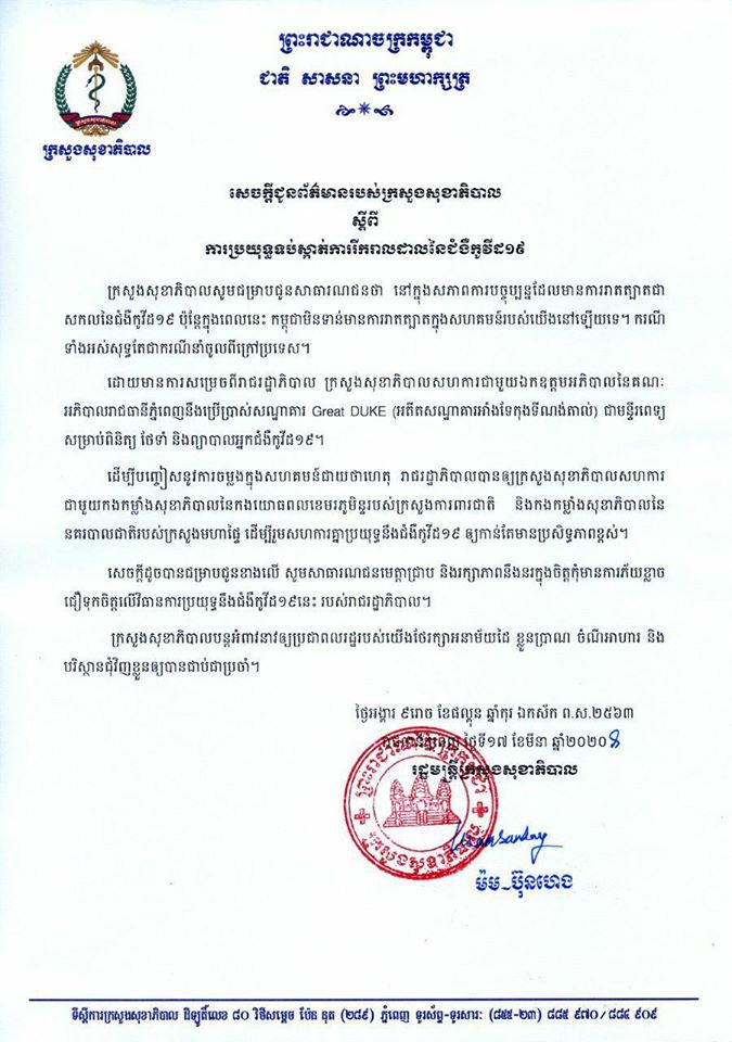 សេចក្តីដូចបានជំរាបជូនខាងលើ សូមសាធារណៈជនមេត្តាជ្រាប និងរក្សាភាពនឹងនរក្នុងចិត្ត កុំមានការភ័យខ្លាច ជឿទុកចិត្តលើវិធនាការប្រយុទ្ធនឹងជំងឺកូវីត១៩ នេះ របស់រាជរដ្ឋាភិបាល៕