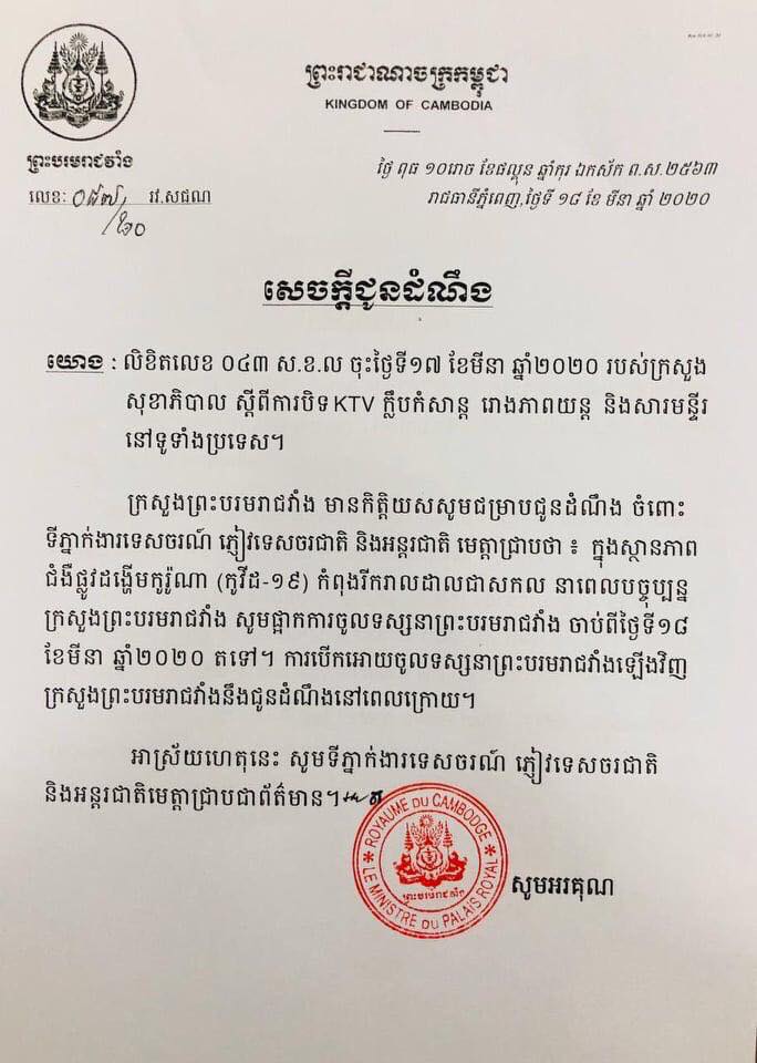 ការដាក់បំរាមហាមចូលទស្សនាព្រះបរមរាជវាំងនេះ បន្ទាប់ពីក្រសួងសុខាភិបាលបានស្នើឲ្យអភិបាលរាជធានី ខេត្ត-ក្រុងទាំងអស់ បិទ KTV រោងភាពយន្ត សារមន្ទីរ ក្លឹបកម្សាន្តនៅទូទាំងប្រទសកម្ពុជា។