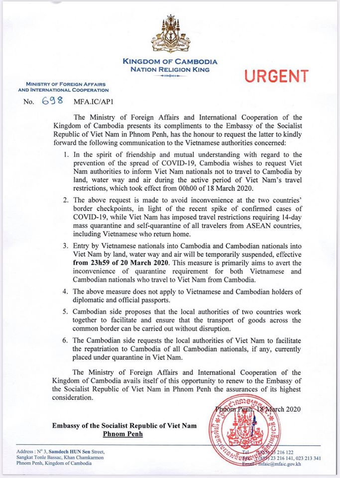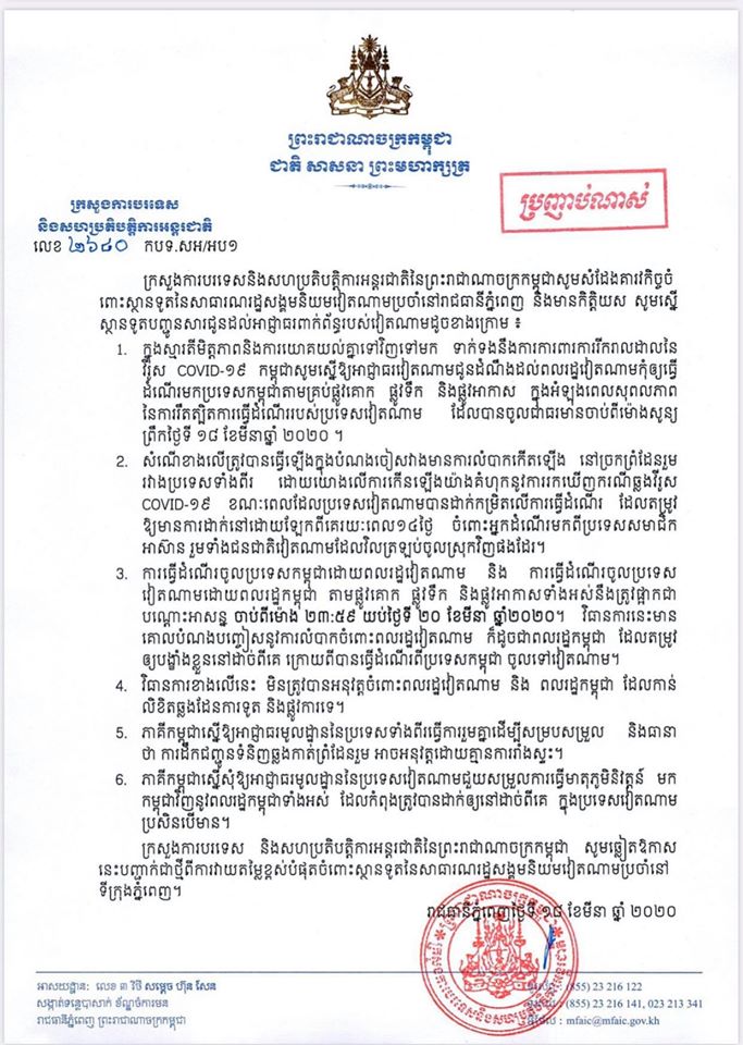 បន្ទាប់ពីមានបទបញ្ជាពីសម្តេច ហ៊ុន សែន នាយករដ្ឋមន្រ្តីនៃកម្ពុជា ចេញបញ្ជាឲ្យរដ្ឋមន្ត្រីក្រសួងមហាផ្ទៃ សម្តេចក្រឡាហោម ស ខេង ចេញសេចក្តីប្រកាសព័ត៌មានហាមឃាត់មិនឲ្យប្រជាពលរដ្ឋវៀតណាម ចូលកាន់ប្រទេសកម្ពុជា និងមិនឲ្យប្រជាពលរដ្ឋកម្ពុជា ចេញទៅប្រទេសវៀតណាមនោះ នៅព្រឹកថ្ងៃទី១៩ ខែមីនា ឆ្នាំ២០២០នេះ ក្រសួងការបរទេសនិងសហប្រតិបត្តិការអន្តរជាតិកម្ពុជា បានចេញលិខិតមួយច្បាប់ផ្ញើជូនស្ថានទូតវៀតណាមប្រចាំប្រទេសកម្ពុជា ដោយបញ្ជាក់អំពីការបិទព្រំដែនមួយរយៈ ដោយមិនអនុញ្ញាតឱ្យប្រជាជនប្រទេសទាំងពីរ ឆលងកាត់ឡើង។