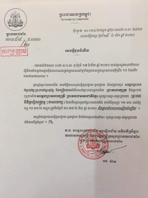 នៅក្នុងសេចក្តីជូនដំណឹងនេះបានបញ្ជាក់ថា ក្រសួងព្រះបរមរាជវាំង មានកិត្តិយសសូមបង្គំទូលថ្វាយ-ទូលថ្វាយ និងជំរាបជូនសម្តេចរាជវង្សានុវង្ស-រាជវង្សានុវង្ស និងមន្ត្រីរាជការបំរើការនៅព្រះរាជខុទ្ទកាល័យព្រះមហាក្សត្រ និងព្រះរាជខុទ្ទកាល័យសម្តេចព្រះមហាក្សត្រី ព្រះវររាជមាតាជាតិខ្មែរ សូមព្រះមេត្តា-មេត្តាជ្រាបថា ព្រះរាជពិធីត្រិស្តសង្ក្រាន្ត (ភាណយក្ស) ដែលនឹងប្រារព្ធនៅព្រះបរមរាជវាំង ចាប់ពីថ្ងៃសុក្រ ១២រោច ដល់ថ្ងៃចន្ទ ១៤រោច ខែផល្គុន ត្រូវនឹងថ្ងៃទី២០-២៣ ខែមីនា ឆ្នាំ២០២០ នឹងផ្អាកមិនមានការរៀបចំឡើយ។