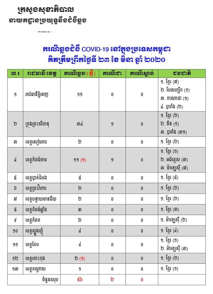 គួររម្លឹកថា មកដល់ព្រឹកថ្ងៃទី២៣ ខែមីនា ឆ្នាំ២០២០នេះ កម្ពុជា មានអ្នកផ្ទុកជំងឺកូវីដ១៩ ចំនួន៨៦នាក់ហើយ ក្នុងនោះអ្នកជំងឺដែលបានជាសះស្បើយមាន២នាក់ បុរសជនជាតិចិន និងនារីជនជាតិអង់គ្លេស៕