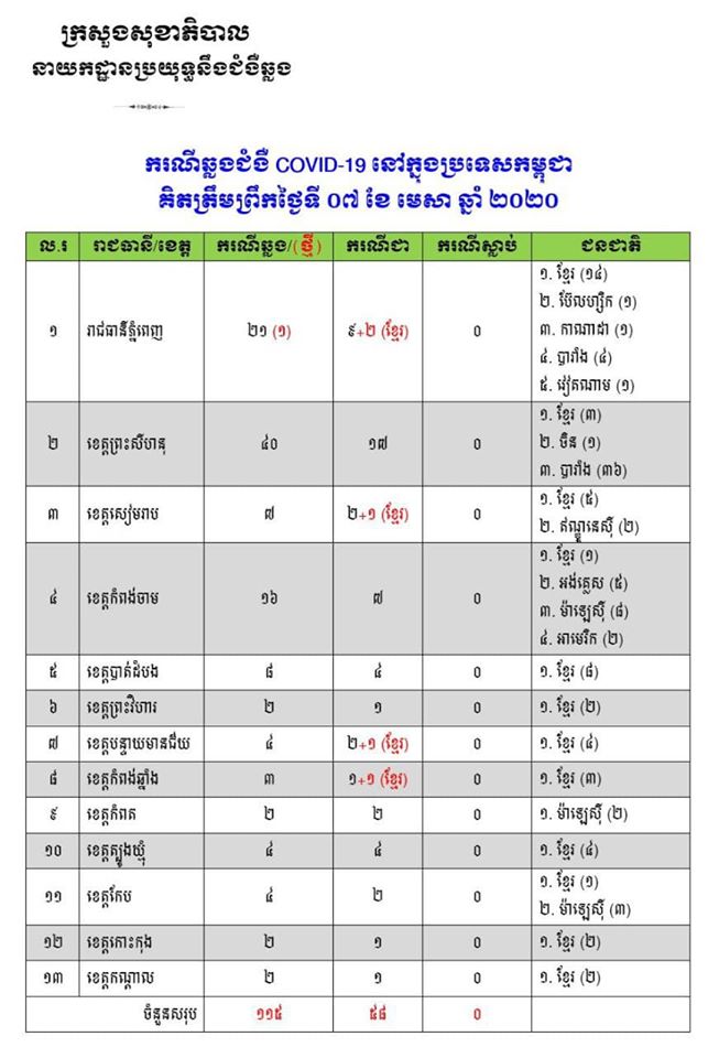 គួរបញ្ជាក់ថា នៅប្រទេសកម្ពុជា មានអ្នកឆ្លងជំងឺកូវីដ-19 សរុបចំនួន១១៥នាក់ ដែលរហូតមកដល់ពេលនេះ មានអ្នកជាសះស្បើយចំនួន៥៨នាក់។ យ៉ាងណា ក្រសួងសុខាភិបាល បានបញ្ជាក់ថា ពុំទាន់រកឃើញភ័ស្តុតាងបញ្ជាក់ថា មានការឆ្លងក្នុងសហគមន៍នៅឡើយទេ តែលទ្ធភាពនឹងអាចកើតមានឡើង៕