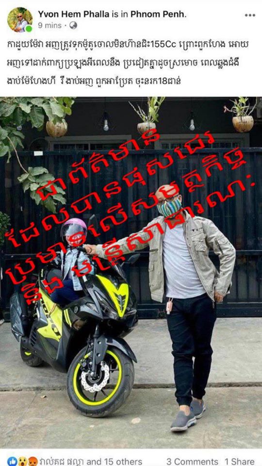 បុរសម្នាក់ឈ្មោះហែម ផល្លា ប្រើប្រាស់គណនីហ្វេសប៊ុកឈ្មោះ YVON HEM Phalla បានផុសព័ត៌មានជេរប្រមាថមើលងាយយ៉ាងខ្លាំងមកលើសមត្ថកិច្ចអនុវត្តច្បាប់ កាលពីថ្ងៃទី០៤ ខែឧសភា ឆ្នាំ២០២០ បានធ្វើឱ្យប៉ះពាល់ធ្ងន់ធ្ងរដល់កិត្តិយសរបស់សមត្ថកិច្ច ដែលបានខិតខំបំពេញភារកិច្ចក្នុងការអនុវត្តរឹតបន្តឹងច្បាប់ចរាចរណ៍ផ្លូវគោក។