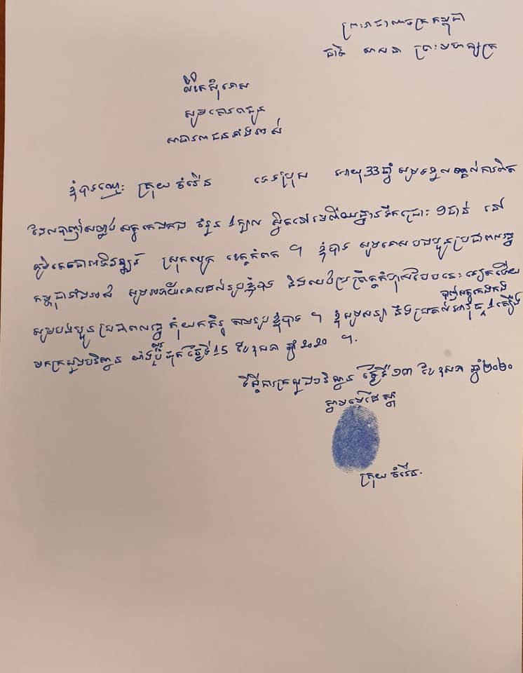 បុរសឈ្មោះគ្រុយ ចំរើន បានសរសេរនៅក្នុងលិខិតសុំអភ័យទោសចំពោះសាធារណជនថា “សូមទទួលស្គាល់ការពិតដែលបាញ់សម្លាប់សត្វកេងកងធំ ចំនួន១ក្បាល ស្ថិតនៅក្នុងរមណីយដ្ឋាន ទឹកធ្លាក់៩ជាន់ នៅភូមិតេជោអភិវឌ្ឍន៍ ស្រុកឈូក ខេត្តកំពត។ ខ្ញុំបាទសូមទោសប្រជាពលរដ្ឋកម្ពុជាទាំងអស់ សូមអភ័យទោសដល់រូបខ្ញុំបាទ និងឈប់ប្រព្រឹត្តកំហុសបែបនេះទៀតហើយ។ សូមបងប្អូនប្រជាពលរដ្ឋកុំយកគំរូតាមរូបខ្ញុំបាទ។ ខ្ញុំសូមសន្យានឹងប្រគល់អាវុធ ដែលបានបាញ់សត្វកេងកងនោះ មកក្រសួងបរិស្ថាន…”។