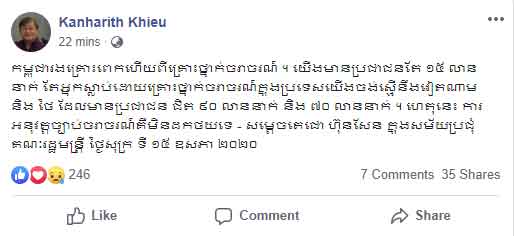 យោងតាមការបង្ហោះសារពីឯកឧត្តម ខៀវ កាញ៉ារីទ្ធ រដ្ឋមន្ត្រីក្រសួងព័ត៌មាន បានឲ្យដឹងថា “កម្ពុជារងគ្រោះពេកហើយពីគ្រោះថ្នាក់ចរាចរណ៍ ។ យើងមានប្រជាជនតែ១៥លាននាក់ តែអ្នកស្លាប់ដោយគ្រោះថ្នាក់ចរាចរណ៍ក្នុងប្រទេសយើងចង់ស្មើនឹងវៀតណាម និង ថៃ ដែលមានប្រជាជន ជិត ៩០ លាននាក់ និង ៧០ លាននាក់ ។ ហេតុនេះ ការអនុវត្តច្បាប់ចរាចរណ៍គឺមិនដកថយទេ – សម្តេចតេជោ ហ៊ុនសែន ក្នុងសម័យប្រជុំគណៈរដ្ឋមន្ត្រី ថ្ងៃសុក្រ ទី ១៥ ឧសភា ២០២០”។