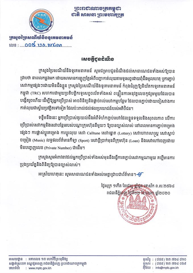 យោងតាមសេចក្តជូនដំណឹងរបស់ក្រសួងប្រៃសណីយ៍និងទូរគមនាគមន៍ លេខ០០៥បទ.សជណ ចុះថ្ងៃសុក្រ ១កើត ខែជេស្ឋ ឆ្នាំជូត ទោស័ក ព.ស ២៥៦៤ ត្រូវនឹងថ្ងៃទី២២ ខែឧសភា ឆ្នាំ២០២០ បានបញ្ជាក់ថា “ក្រសួងប្រៃសណីយ៍ និងទូរគមនាគមន៍ សូមជម្រាបជូនដំណឹងដល់សាធារណជនទាំងអស់ឱ្យបានជ្រាបថា នាពេលកន្លងមក ដោយសារមានការត្អូញត្អែរអំពីបញ្ហាកាត់លុយតាមទូរស័ព្ទដោយពុំដឹងមូលហេតុ ឬការភ្ជាប់សេវាកម្មផ្សេងដោយមិនដឹងខ្លួន ក្រសួងប្រៃសណីយ៍ និងទូរគមនាគមន៍ កំពុងជំរុញឱ្យនិយ័តករទូរគមនាគមន៍កម្ពុជា (TRC) សហការជាមួយប្រតិបត្តិករ ទូរស័ព្ទចល័តទាំងអស់ពន្លឿនការអនុវត្តលេខកូដរួមមួយ ដែលបានកាត់លុយជាស្វ័យប្រវត្តិតទៅទៀតដែលប៉ះពាល់ដល់ផលប្រយោជន៍របស់អតិថិជន។